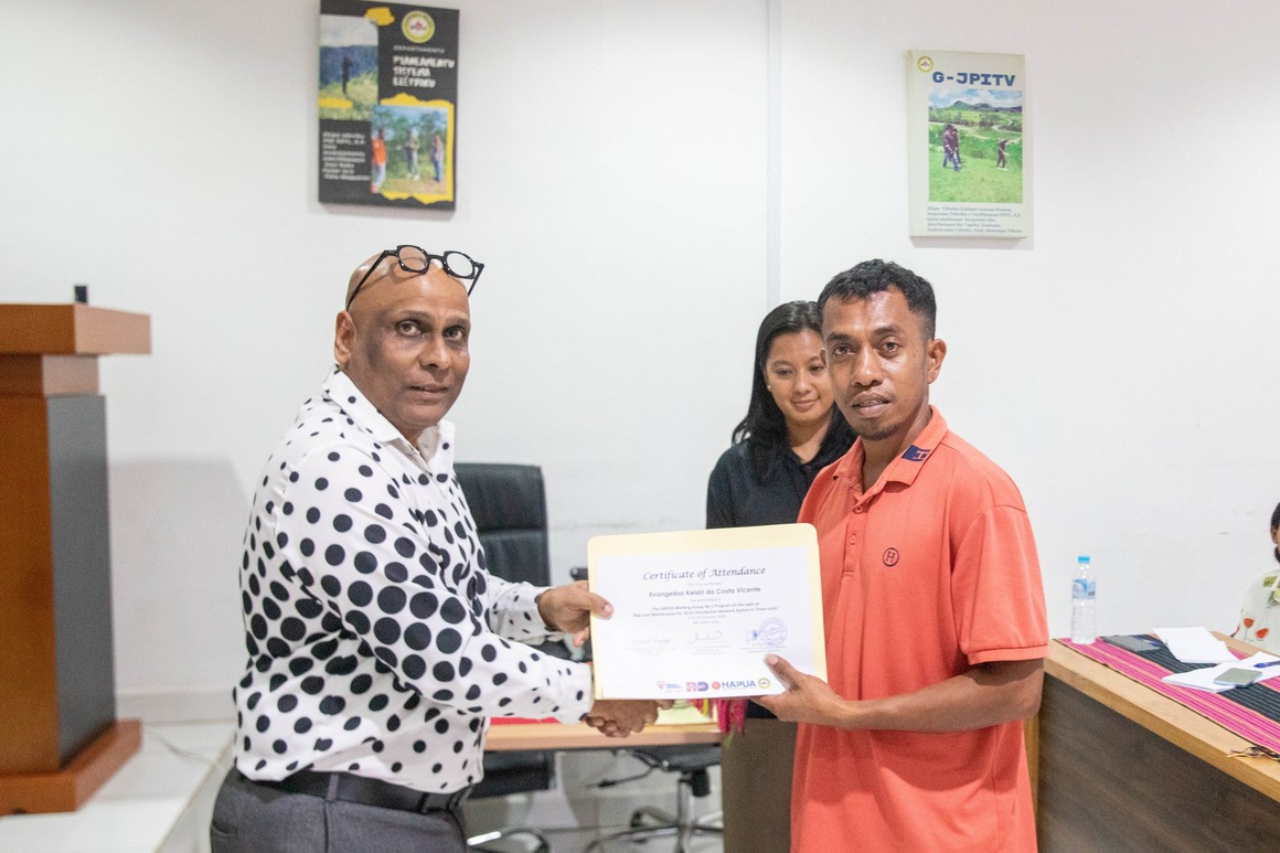 Díli, 19 Fevereiru 2025|Prezidente Komisaun Ezekutiva EDTL, E.P., Dr. Paulo da Silva, akompaña husi Komisáriu Ezekutivu Servisu Tékniku, Eng. Roberto Manuel Marçal, Diretór DRDAC Sr. Zil Nunes, Diretór Transmisaun Eng. Egídio, Diretóra Rekursu Umanu Sra. Fátima Abdad no Kordenadór Formasaun Eng. Seguismundo, halo enseramentu ba formasaun “Hotline Maintenance” ba asistente tékniku sira ne’ebé apoiu husi Konsultór Tenaga Nasional Berhad (TNB) Malázia/Volta Forensic, durante loron tolu iha edifísiu EDTL, E.P Kaikoli-Díli.